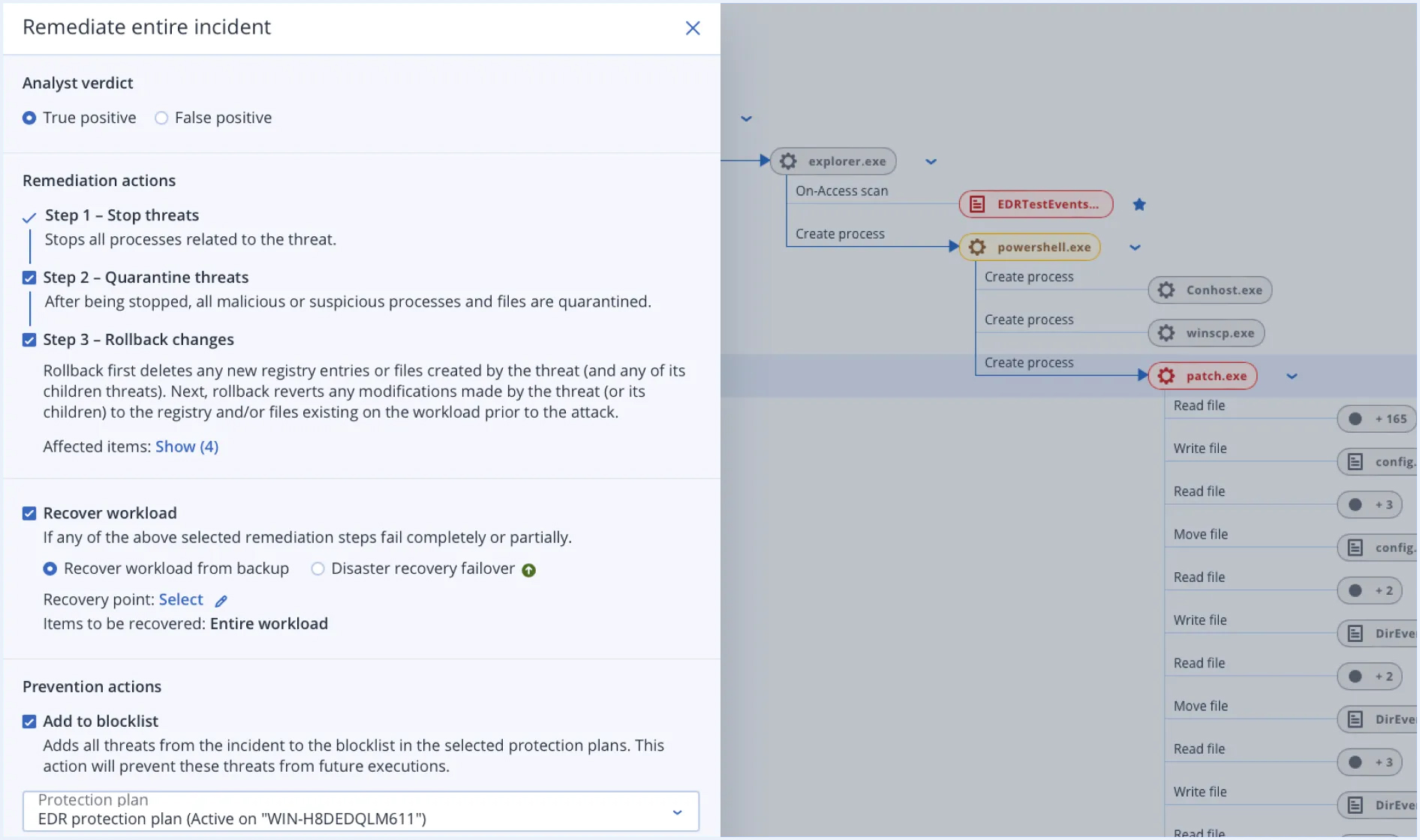 If they determine that activities are part of malicious actions, analysts can easily tell the service to block them as soon as they are detected at a later time, quarantine all processes involved, and automatically undo all changes made, including restoring data from backups. Combining these automation capabilities with the Continuous Data Protection (CDP) capabilities of Netcore protection platform can greatly reduce the chances of data loss and keep all business workloads running in an automated manner.