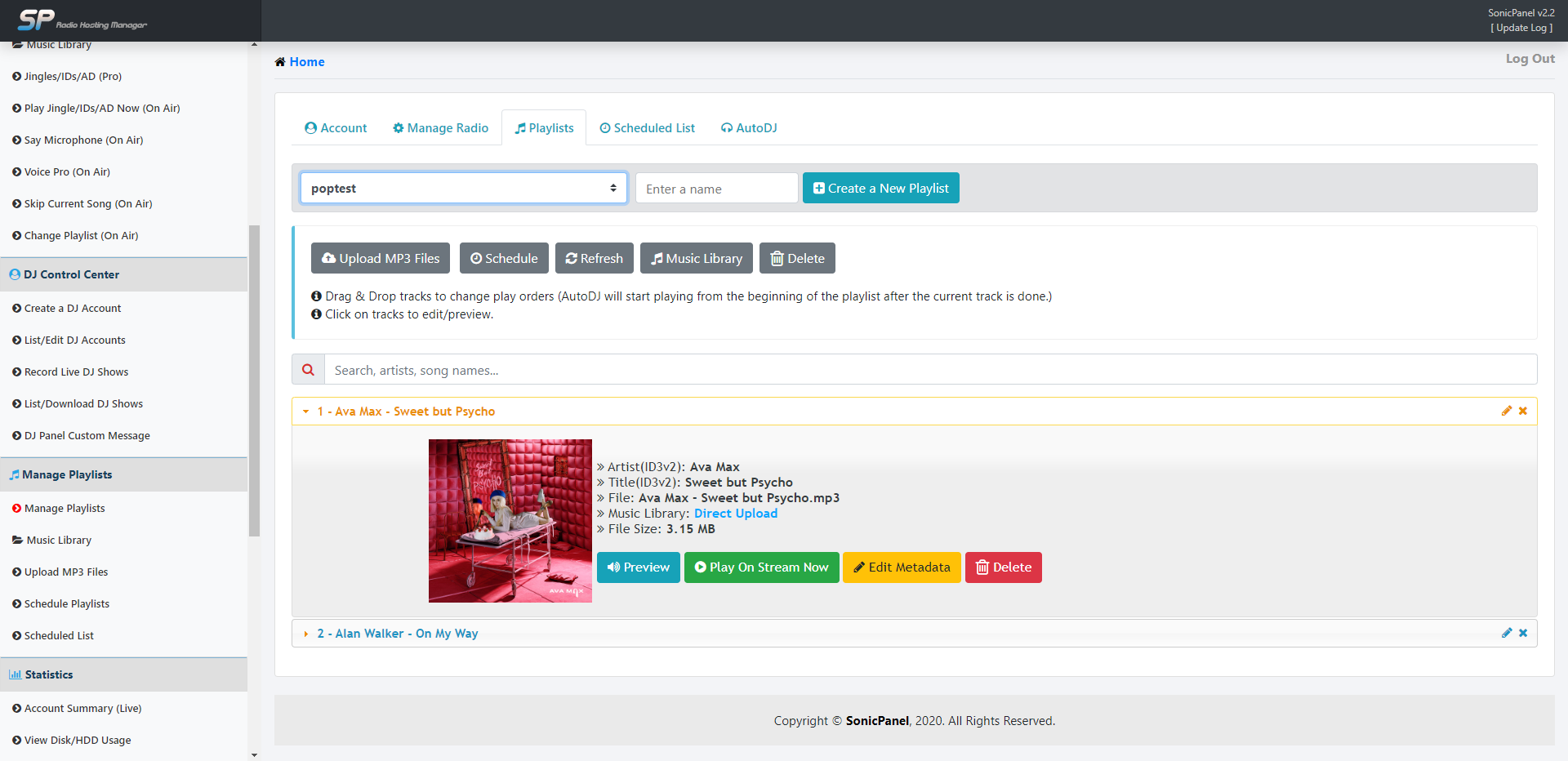 Our service has the most advanced playlist manager while it is easy to use. Your client can simply drag&drop tracks to change the play orders of a playlist, Drag&Drop MP3 upload system via browser, 100x faster and chunked. Editing metadata of the tracks fully ID3V2 and playing a track immediately on the radio, searching tracks without load. All features are on the playlist manager is without dropping listeners and no interrupts on the radio.